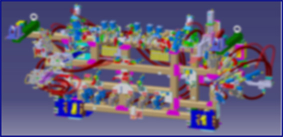 | 業務プロセス | 1.新機種導入計画または新設備製作の仕様打ち合わせ、日程調整 2.CATIA V5での構想設計、部品解析、ロボットシミュレーション ※図Ⅰ参照 3.組立図、部品図、部品表などの図面作成 ※図Ⅱ参照 4.部品製作、組立、電気工事、検査,測定、作動検証(製作請負時のみ) ※図Ⅲ参照 5.生産ラインへの設備据付け、又は立会い、不具合対応等アフターフォロー |
