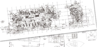 | 3D上での構想設計の内容をより具現化し、生産工程の機能が解るよう図面作成を行います。 製造工程での効率化、日程短縮、コスト削減等を考慮し、現場での加工、組立が容易に行えるよう、精度の高い図面を提供しております。 |